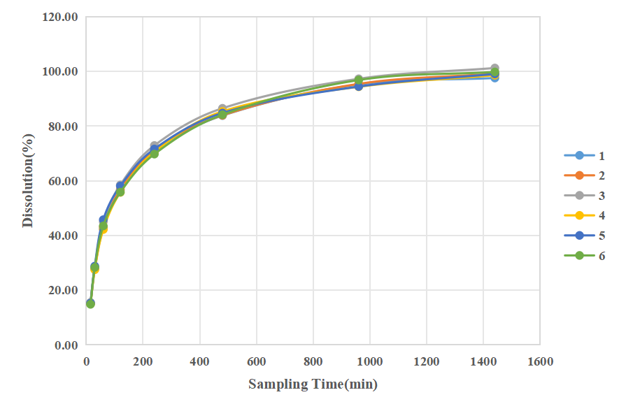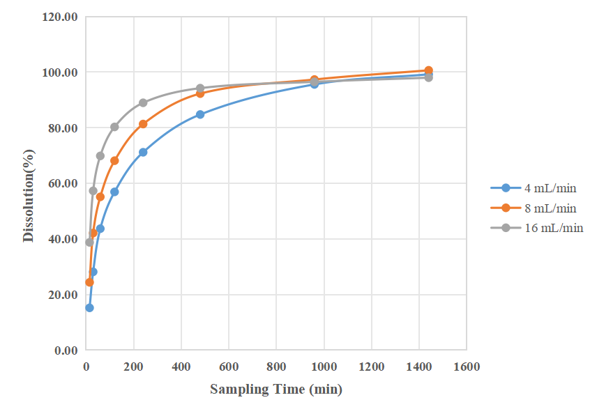①Studies of velocity: The injection was able to reach the dissolution endpoint at all velocity of 4/8/16 mL/min. And the dissolution rate was slowest at 4mL/min.