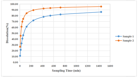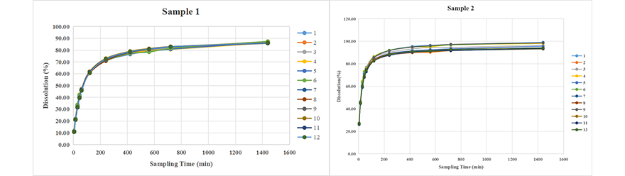 ②Distinguish: Under this dissolution method, there is a significant difference between Sample 1 and Sample 2 in terms of in vitro release behavior. It indicates that the method has good discrimination between Sample 1 and Sample 2